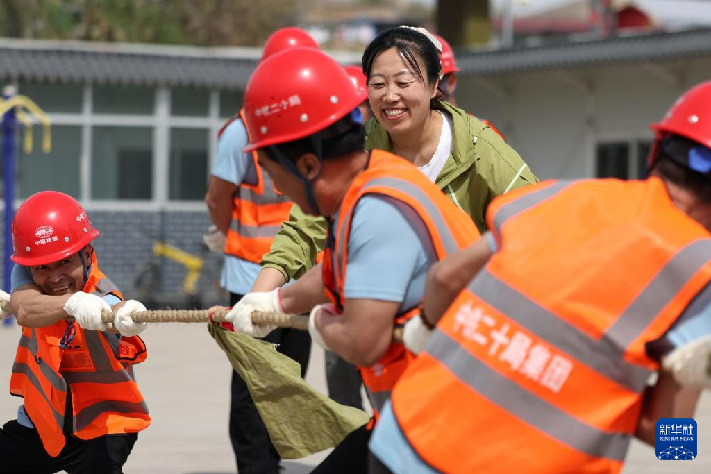 4月29日,中铁二十局的建设者参加拔河比赛。新华社记者 陈斌 摄