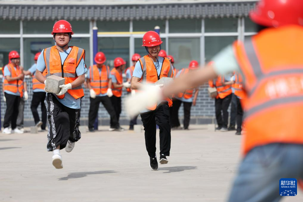 4月29日,中铁二十局的建设者参加混凝土接力搬运比赛。新华社记者 陈斌 摄