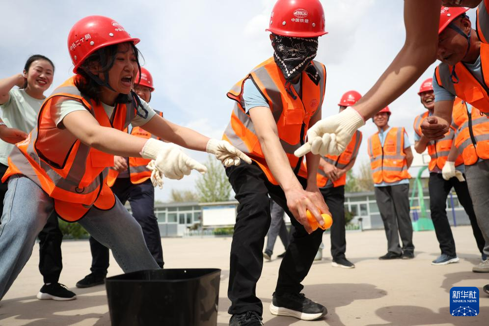 4月29日,中铁二十局的建设者参加蒙眼“搅拌”比赛。新华社记者 陈斌 摄