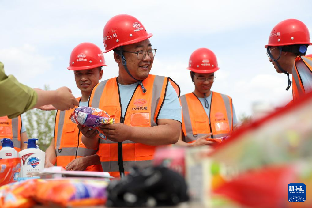 4月29日,中铁二十局的建设者在趣味活动中领取纪念品。新华社记者 陈斌 摄