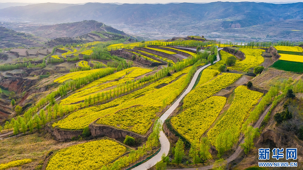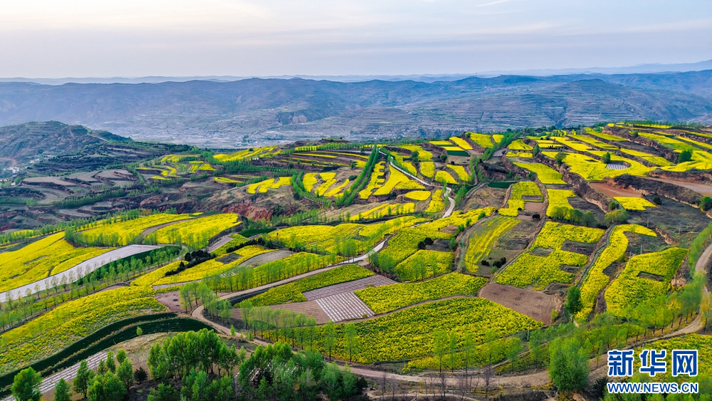 近日,甘肃省平凉市庄浪县盘安镇的千亩油菜花相继绽放。放眼望去,满目的油菜花如同金色的毯子铺展开来,在微风中摇曳,与层层叠叠的梯田、蜿蜒的山路勾勒出一幅田园春景图。新华网发(李鼎 摄)